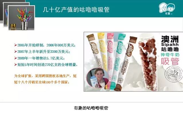 咕嚕嚕吸管?澳洲神奇吸管?這可引起了大家的好奇心。當家人樓總圍繞這種神奇的吸管進行案例分享。原來一根普通的吸管中間加上了巧克力牛奶咖啡等顆粒飲料,就變得完全與眾不同,深受孩子們的喜愛,還獲得不少創(chuàng)意大獎呢!據(jù)說這是一位爺爺為了讓孫子喜歡喝鮮奶而發(fā)明,可見創(chuàng)新有時很簡單,它就源于我們的生活。