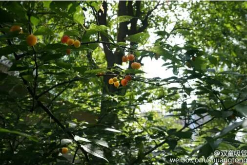 有句老話說(shuō)得好:櫻桃好吃樹難栽。看雙童種下的這幾棵櫻桃樹,多精神,樹上結(jié)的果子也是不少呢!看照片,這櫻桃都長(zhǎng)到墻外去了!