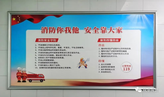 在“雙童”,各類宣傳標(biāo)識(shí)、消防器材隨處可見(jiàn),安全意識(shí)深入人心!正是因?yàn)椤半p童”對(duì)安全生產(chǎn)的這份敬畏之心,才讓每一位員工心中都筑起了一道安全防線。