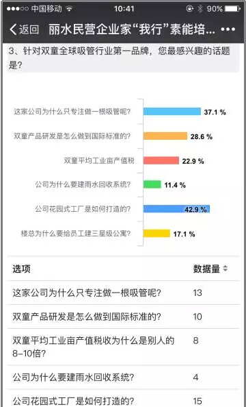而值得一提的是,麗水市政府已經(jīng)連續(xù)4次組織企業(yè)主來(lái)“雙童”參觀學(xué)習(xí)啦!他們對(duì)此次的學(xué)習(xí)也非常重視,早在上個(gè)月,就已經(jīng)在內(nèi)部的微信群里宣傳起了“雙童”,而且還特意針對(duì)這次的參觀設(shè)計(jì)了調(diào)查問卷,足以看出他們的用心之處!