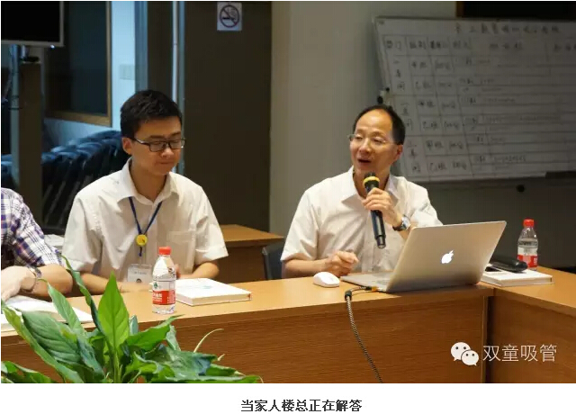 參觀后,大家也來(lái)到了九樓閣,與兩位當(dāng)家人進(jìn)行深入交流,互動(dòng)提問。首先,當(dāng)家人樓總圍繞“雙童”的發(fā)展歷程和經(jīng)營(yíng)理念進(jìn)行分享,同時(shí)介紹了“雙童”的創(chuàng)新工作和五年發(fā)展規(guī)劃。