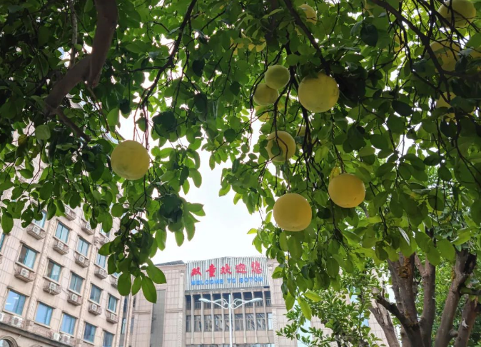 “雙童”廠區(qū)里的柚子可不止屋頂果園才能看見,從“雙童”行政大樓的窗戶往下看,“雙童”人散步休閑的景觀湖和1號樹小公園邊就種滿了柚子。
