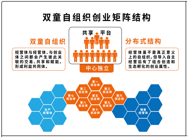 經(jīng)過(guò)一段時(shí)間的系統(tǒng)性學(xué)習(xí)后,樓仲平將學(xué)習(xí)到的理念知識(shí)應(yīng)用到“雙童”的經(jīng)營(yíng)實(shí)踐中,組合出了適合企業(yè)發(fā)展的自組織創(chuàng)業(yè)裂變模式。