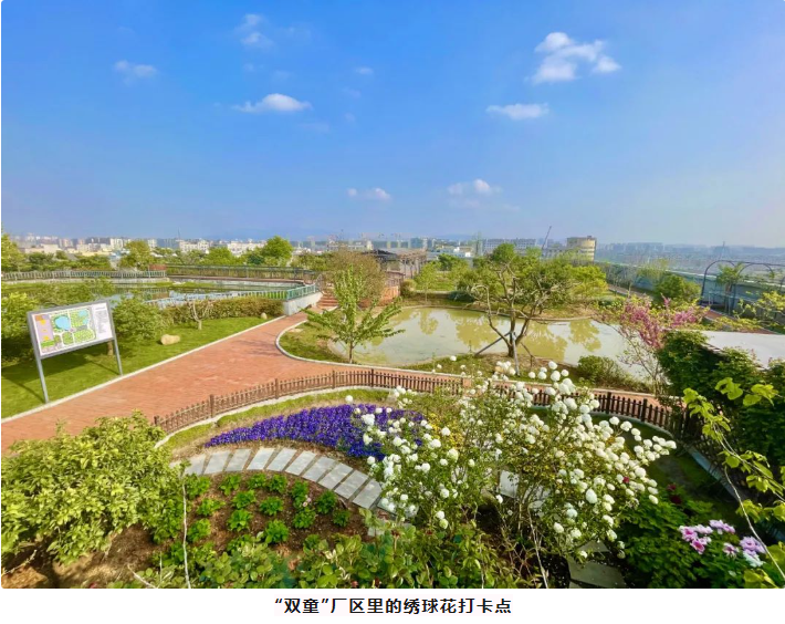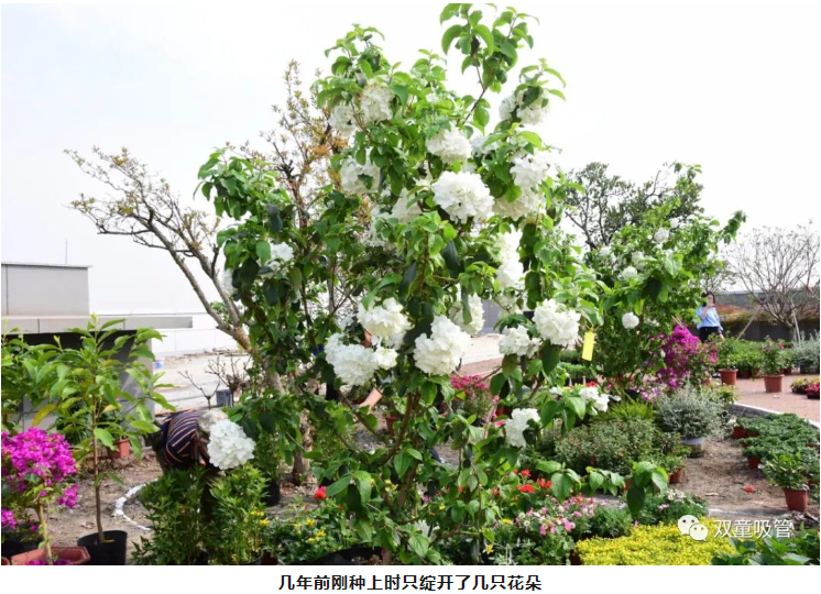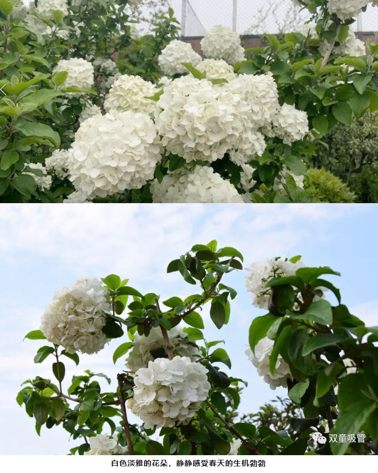 一進(jìn)入“雙童”空中花園,就能看到群花斗艷。在萬紫千紅里,一顆白色的花樹尤其顯眼。繡球花盛開在春季,其余時間都是綠色枝丫。每年的四月是最佳觀賞期,也就是說,現(xiàn)在想一覽好風(fēng)光的可要抓緊時間啦!