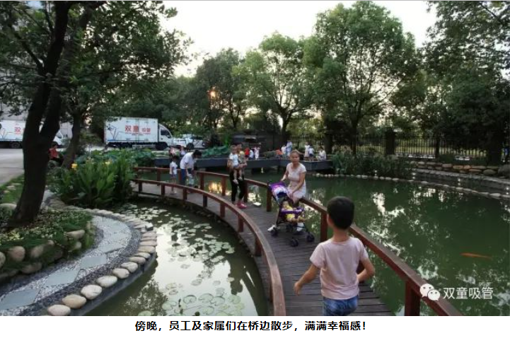 在一天忙碌的工作結束后,“雙童”人喜歡漫步在九曲橋邊,家屬們也常常帶著孩子來這里乘涼聊天,湖邊河卵石的小路上到處坐滿了人,這里的好風光給大家?guī)砹藵M滿的幸福感!