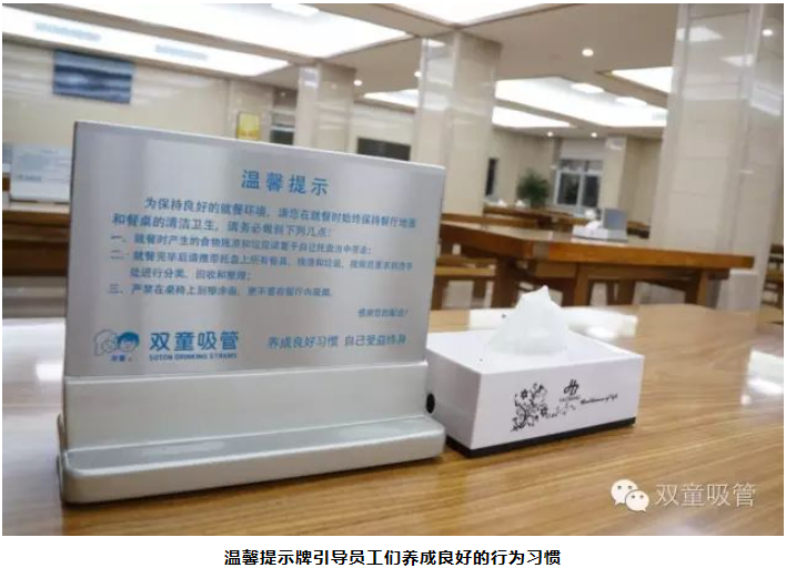 在“雙童”600余人就餐的員工餐廳里,濕垃圾也是“雙童”垃圾分類(lèi)經(jīng)的一大重點(diǎn)!“五個(gè)碗”是雙童員工的餐具標(biāo)配,在每張餐桌上都擺放著用餐規(guī)范的標(biāo)語(yǔ)提示牌。