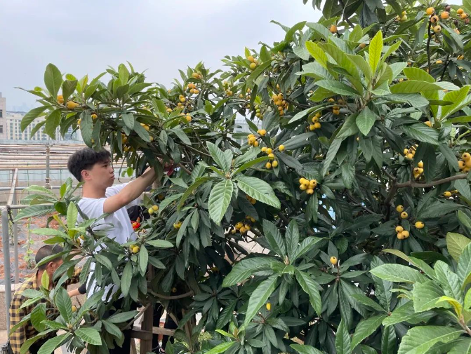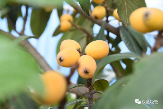 瞧!在“雙童”空中花園的枇杷林,一棵棵枇杷樹上爬滿了黃澄澄的枇杷,把樹枝都壓彎啦!粒大飽滿的枇杷果肉都快撐破果皮,讓人看著直流口水,巴不得一躍而上,盡情品嘗這美味!