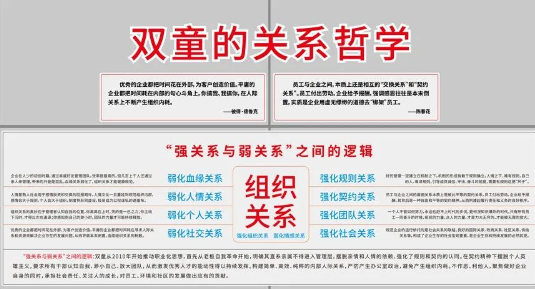 關(guān)系哲學(xué)強(qiáng)調(diào)要擺脫親情和人情的依賴、強(qiáng)化了規(guī)則和契約的認(rèn)同。在正確理解信息化環(huán)境的彼此訴求下,“雙童”也逐漸建立起科學(xué)規(guī)范的組織關(guān)系:重規(guī)則、守契約、講創(chuàng)造、論績效、同理心、共成長,引導(dǎo)員工向職業(yè)化思想轉(zhuǎn)變。