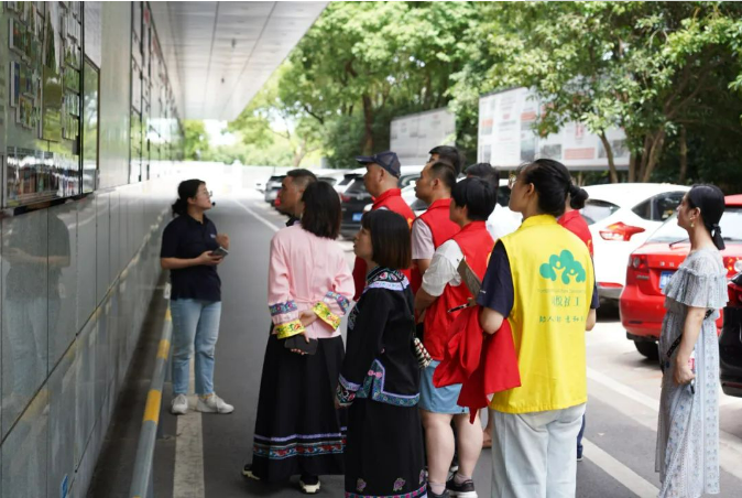 一行人專注地聆聽文化長廊里豐富的內(nèi)容介紹