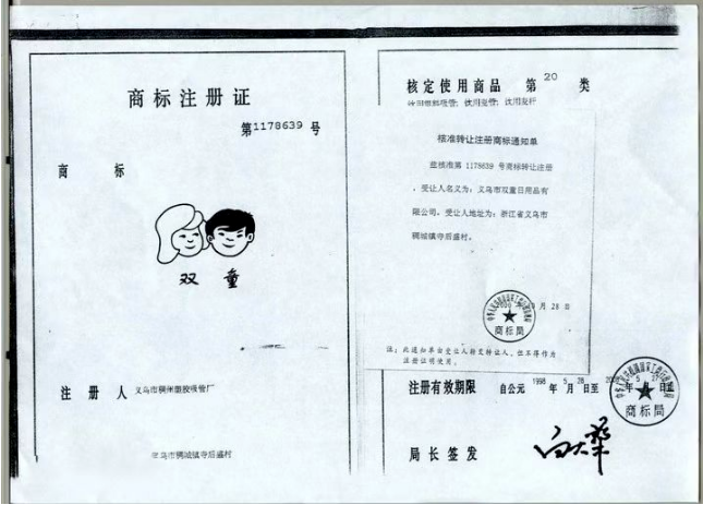 那時(shí)很多企業(yè)還沒有商標(biāo)的概念,樓仲平走在了前列,他的“雙童”牌,成了整個(gè)義烏的第17個(gè)商標(biāo)。