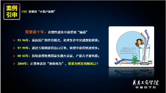 所以從2004年開始,“雙童”開始慢慢放棄“大客戶”,轉(zhuǎn)而推行“小客戶原則”。通過(guò)戰(zhàn)略轉(zhuǎn)變,“雙童”把原先每100根吸管僅8分錢的利潤(rùn),提升到了有20%以上利潤(rùn)率的提價(jià)空間,牢牢掌握了“雙童”經(jīng)營(yíng)的主動(dòng)權(quán)。