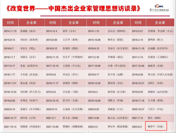 樓仲平老師在創(chuàng)業(yè)實(shí)踐中,持續(xù)20多年自學(xué)管理學(xué),積累了深厚的管理思想、實(shí)踐認(rèn)知和實(shí)戰(zhàn)經(jīng)驗(yàn),從一個(gè)挑貨郎擔(dān)的草根創(chuàng)業(yè)者成長(zhǎng)為教育部認(rèn)證的中國(guó)優(yōu)秀創(chuàng)業(yè)導(dǎo)師,并被復(fù)旦大學(xué)東方管理研究院收錄到《改變世界-中國(guó)杰出企業(yè)家管理思想》的50位中國(guó)優(yōu)秀企業(yè)家之一。同時(shí)期,中國(guó)規(guī)模最大的財(cái)經(jīng)媒體頻道《第一財(cái)經(jīng)》,就此話題制作播出訪談專(zhuān)題片《樓仲平:順時(shí)而變》,將樓老師的創(chuàng)業(yè)精神傳遞給更多人。