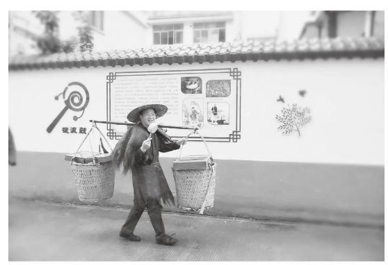 多年后,樓仲平再次拌上雞毛換糖貨郎擔裝扮