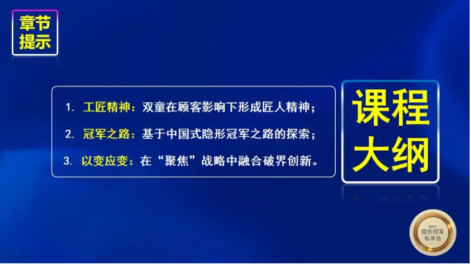 在交付過程中,樓仲平老師將課程分為工匠精神、冠軍之路和“以變應(yīng)變”三大模塊,闡述“雙童”在隱形冠軍探索道路上所經(jīng)歷的各個(gè)周期,并進(jìn)行歸納和提煉,以提供在新產(chǎn)業(yè)環(huán)境下中小企業(yè)戰(zhàn)略發(fā)展的探索和思考。