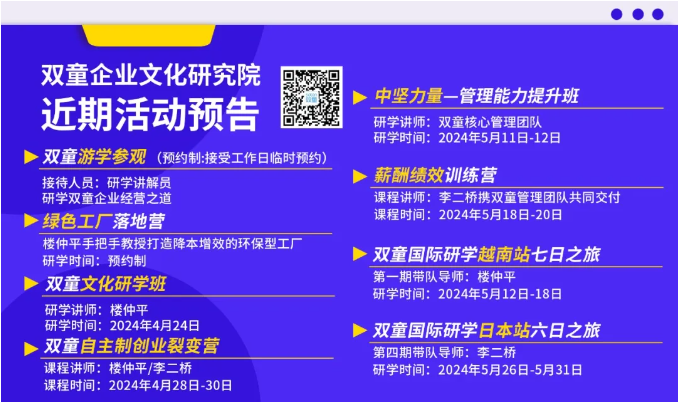 沒趕上本次《冠軍之旅》的朋友也別擔(dān)心,2024年5月26日,雙童總經(jīng)理李二橋也將帶領(lǐng)30多位企業(yè)家朋友一起,走進(jìn)世界500強(qiáng)企業(yè)、百年長壽企業(yè)、專精特新企業(yè),深入企業(yè)工廠內(nèi)部,從“細(xì)枝末節(jié)”處考察,全方面學(xué)習(xí)優(yōu)秀經(jīng)營理念,助力企業(yè)成長!