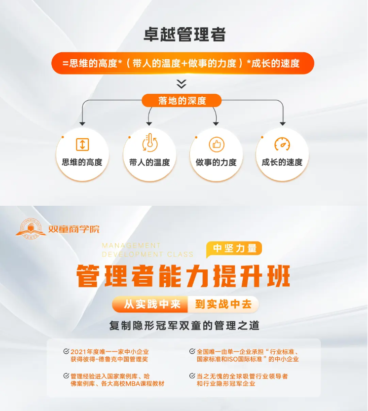 直接影響企業(yè)管理水平的可能不是決策者,而是企業(yè)中層管理者的能力。在雙童商學(xué)院對(duì)很多參課學(xué)員的回訪中就發(fā)現(xiàn)了這個(gè)問(wèn)題:即使老板花費(fèi)了很多成本把“雙童”的管理機(jī)制、工具帶回企業(yè),如果沒(méi)有卓越的中高層管理者執(zhí)行,落地成效會(huì)大打折扣!