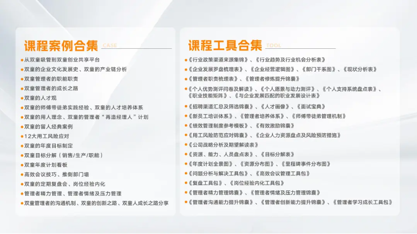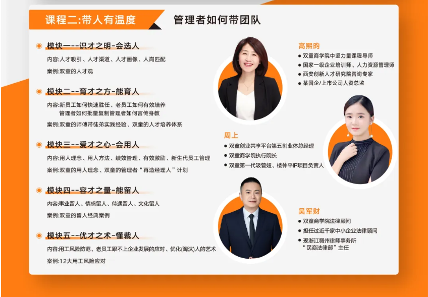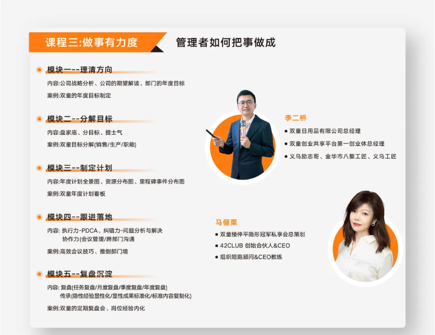 在課程設(shè)置上,也是圍繞思維有高度、帶人有溫度、做事有力度、成長(zhǎng)有速度等4大主題展開(kāi),細(xì)致拆分成16大模塊進(jìn)行交付。每個(gè)模塊課程都會(huì)以“雙童”的實(shí)際情況為案例,并直接給到實(shí)用工具!