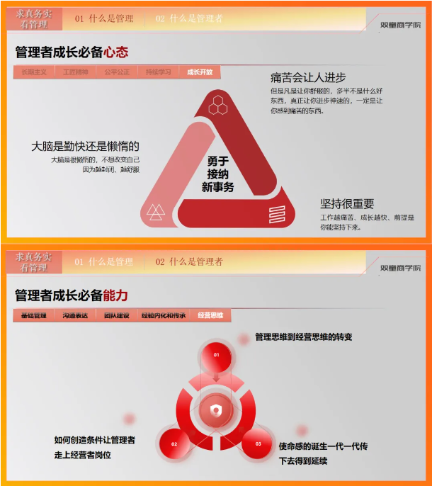 成為優(yōu)秀的管理者首先要理解什么是管理,李二橋老師先從定義、原則、流程三方面對(duì)“管理”科學(xué)解讀,并以自己在“雙童”作為管理者的不斷成長經(jīng)歷作為案例,詳細(xì)分解了優(yōu)秀企業(yè)管理者成長所需要具備的心態(tài)和能力,并現(xiàn)場給出了培養(yǎng)能力的方法。
