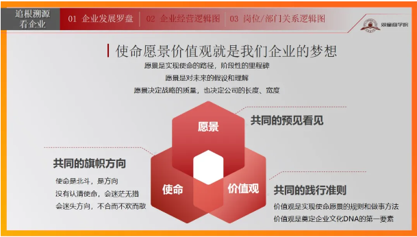 “追根溯源看企業(yè)”旨在讓參訓(xùn)學(xué)員明確自己企業(yè)發(fā)展目標(biāo)、夢想,并推動(dòng)目標(biāo)的實(shí)現(xiàn);正確認(rèn)知企業(yè)經(jīng)營現(xiàn)狀,明確企業(yè)盈利的關(guān)鍵點(diǎn)和卡點(diǎn);掌握科學(xué)合理地劃分部門與崗位的依據(jù)和方法。