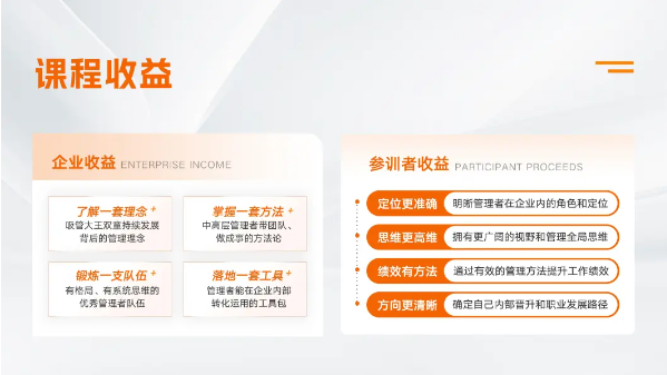 《中堅(jiān)力量》全課程按照思維有高度、帶人有溫度、做事有力度、成長有速度四個(gè)主題分期交付,秉著實(shí)用主義的原則,各位老師在課程交付中,不僅拆解原理,還直接給工具、給方法,以幫助參訓(xùn)企業(yè)全方位的提供管理者綜合素養(yǎng)!