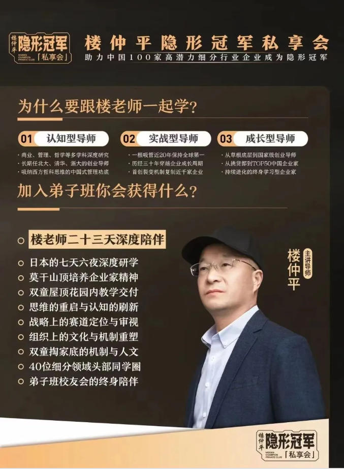 【樓仲平隱形冠軍私享會】是樓總唯一一個全面系統(tǒng)交付46年創(chuàng)業(yè)歷程的經(jīng)驗(yàn)總結(jié)和思維模型的課程。全年6期課程,樓老師23天深度陪伴,從戰(zhàn)略到組織,從創(chuàng)新思維到企業(yè)家精神,幫助你的企業(yè)全方位升級。