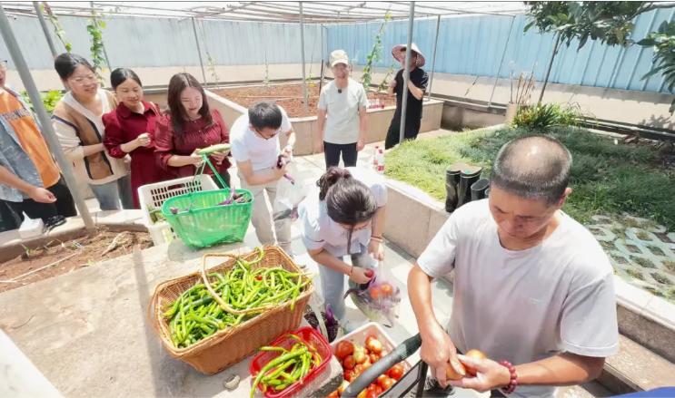 一走進(jìn)菜園,當(dāng)家人樓總就帶著小伙們開啟“戰(zhàn)斗”模式,毫不夸張,只一會兒功夫,黃瓜、番茄被裝滿了一筐又一筐,這種在工廠里也能貼近自然的農(nóng)家生活,真的超幸福!