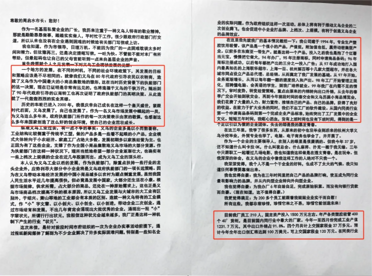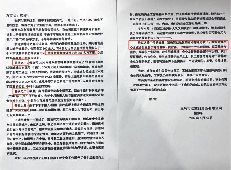 在“走投無路”的情況下,創(chuàng)始人樓仲平在2002年5月16日第一次向政府發(fā)出兩封求助信!他分別給時任義烏市市長周啟水、主管工業(yè)的副市長方浩福寫信,詳細(xì)介紹了“雙童”的發(fā)展成績和當(dāng)下難以為繼的困局,期望政府能夠幫助企業(yè)渡過難關(guān)!