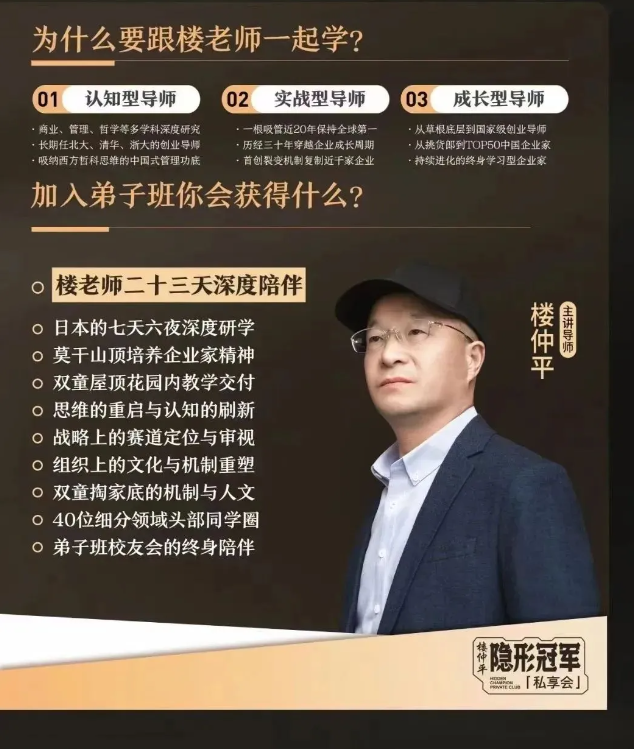 樓仲平【弟子班】是樓總唯一一個全面系統(tǒng)交付46年創(chuàng)業(yè)歷程的經(jīng)驗總結(jié)和思維模型的課程。全年6期課程,樓老師23天深度陪伴,從戰(zhàn)略到組織,從創(chuàng)新思維到企業(yè)家精神,幫助你的企業(yè)全方位升級。