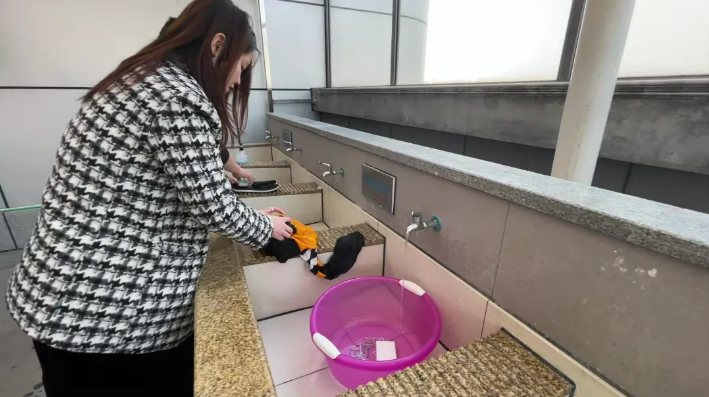 此外,為了維護洗衣房的整潔,“雙童”還設置了一個落地衣物收集區(qū)。阿姨必須將落地的衣物撿起,放入指定的筐內(nèi)。如果衣物是濕的,則需要特別掛在陽光板下,以便晾干。