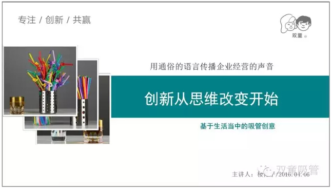 每年四月份,我們的當(dāng)家人樓總就在學(xué)習(xí)會中給員工們分享了《創(chuàng)新從思維改變開始》的課程,鼓勵(lì)員工們多多創(chuàng)新,動員大家多多參與到即將舉辦的首屆吸管創(chuàng)意大賽中。他說,全球最頂尖的吸管一定在“雙童”,沒有人比我們更了解吸管,相信員工們一定可以提交上來非常棒的創(chuàng)意作品!