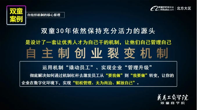 烏卡時代下,樓仲平意識到數(shù)字化只是一種技術(shù)、一個工具,最終是服務(wù)于人的。它為員工提供工作便利的同時,也讓傳統(tǒng)雇傭關(guān)系面臨瓦解。面對數(shù)字化挑戰(zhàn),“雙童”決定結(jié)合多種組織機制和中小企業(yè)的特點,自制了一套適用于中小企業(yè)的組織創(chuàng)新制度——自主制創(chuàng)業(yè)裂變機制,讓員工從“要我做”到“我要做”轉(zhuǎn)變。