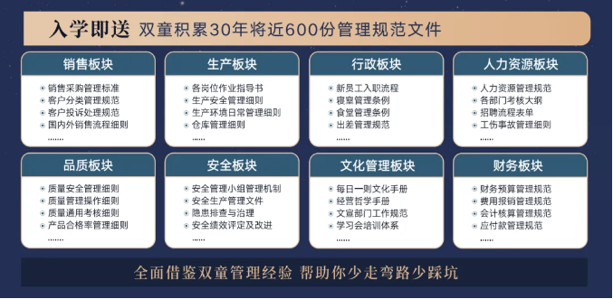 所以,入學(xué)“隱形冠軍樓仲平思享薈”之后,項(xiàng)目組會(huì)將“雙童”積累了30年、包含了銷售、生產(chǎn)、行政、人類資源、品質(zhì)、安全和文化管理7大板塊,將近600分管理規(guī)范文件,全部打包給學(xué)員,幫助學(xué)員企業(yè)能夠全面借鑒雙童管理經(jīng)驗(yàn)、少走彎路、少踩坑!