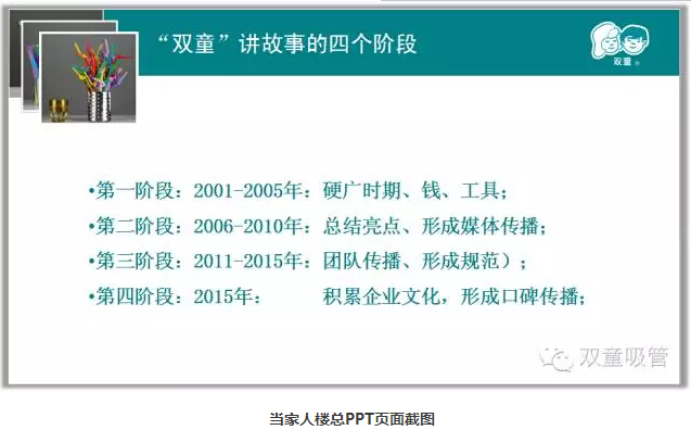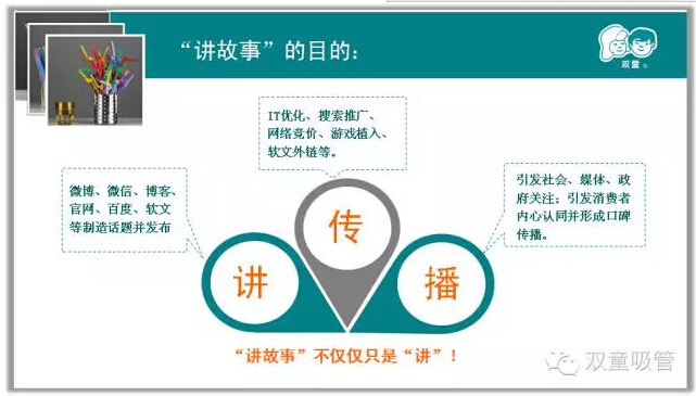 而“雙童”在品牌推廣的過程中,其實也是分階段的。從硬廣時期,每年投入200多萬元做廣告,到后來的塑造差異化亮點,引導(dǎo)媒體給“雙童”講故事,再到成立文宣部門,形成團隊“講故事”,最后達到形成企業(yè)文化,形成口碑傳播。這是一條漫長的道路,需要“雙童”人持之以恒的堅持和努力!