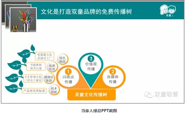 上邊則是政府、媒體關(guān)注的價值觀傳播。三大部分組成了“雙童”的文化傳播樹!而這棵樹也清晰系統(tǒng)地說明了“雙童”是如何傳播“故事”、塑造品牌的!