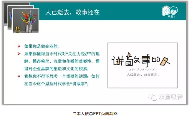 最后,當(dāng)家人樓總向大家說明,你的故事有沒有講好,還要看你在“江湖上流傳”有多少你的故事。如果按照“可口可樂廣告營銷預(yù)算法”通則,按銷售比例的5-15%作為企業(yè)廣告營銷費用提成,其實“講故事”已經(jīng)給企業(yè)省了幾百萬甚至幾千萬的營銷費用了!