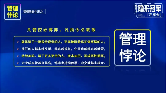 但是根據(jù)管理悖論,“凡管控必博弈,凡指令必耗散”,企業(yè)經(jīng)營(yíng)真正的危險(xiǎn)更多來(lái)源于內(nèi)部的耗散;企業(yè)管理真正的成本來(lái)源于成員之間的博弈。所以,當(dāng)企業(yè)有一定規(guī)模之后,則要用治理的“疏”替代管理的“堵”。治理是在滿(mǎn)足人性訴求下,對(duì)管理的本身進(jìn)行結(jié)構(gòu)優(yōu)化和激勵(lì),通過(guò)“順人性”的規(guī)則和機(jī)制,激發(fā)員工對(duì)經(jīng)營(yíng)結(jié)果承擔(dān)責(zé)任。