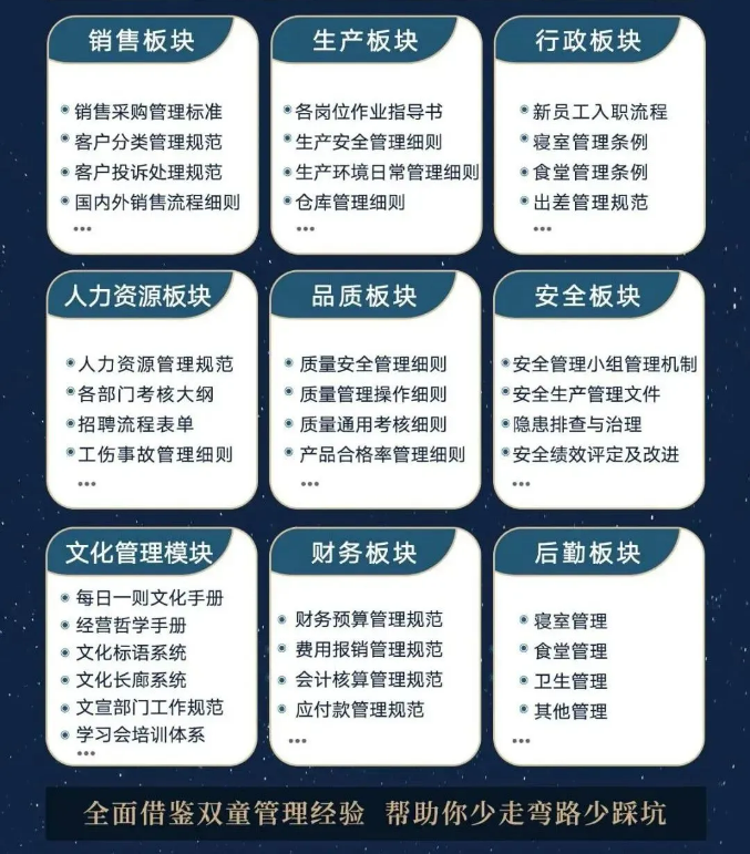 所以,入學(xué)“隱形冠軍樓仲平思享薈”之后,項(xiàng)目組會(huì)將“雙童”積累了30年、包含了銷(xiāo)售、生產(chǎn)、行政、人類(lèi)資源、品質(zhì)、安全、文化管理、財(cái)務(wù)和后勤等9大板塊,近600份管理規(guī)范文件,全部打包給學(xué)員,幫助學(xué)員企業(yè)能夠全面借鑒雙童管理經(jīng)驗(yàn)、少走彎路、少踩坑!