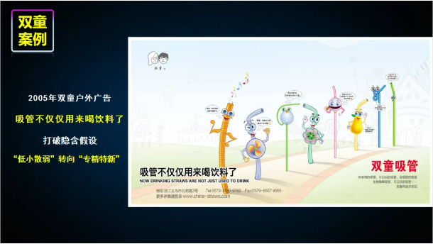 早在2004年,“雙童”就打破了“吸管就是喝飲料的”隱含假設(shè),把它從單一的“喝水”功能向情感化、體驗(yàn)化和娛樂(lè)化延伸,從而給不起眼的小小吸管賦予新的生命,徹底讓“一根吸管”從“不可能”變成了“可能”。