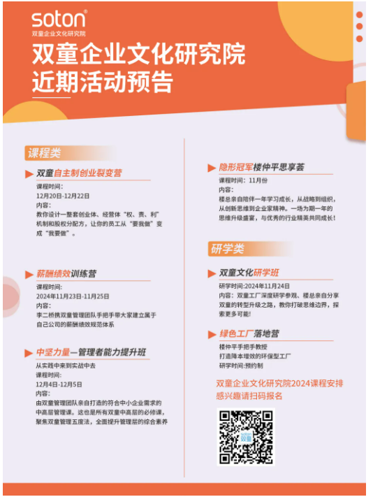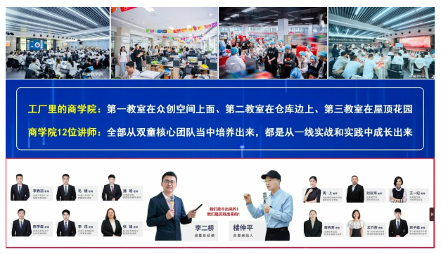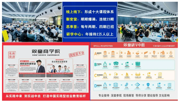 相較于傳統(tǒng)教培行業(yè),雙童商學院的課程設(shè)計更加注重與實際一線工作的緊密聯(lián)系。它鼓勵學員親身體驗企業(yè)環(huán)境、深入創(chuàng)業(yè)社群、貼近員工工作日常、并沉浸于實踐操作的每一個環(huán)節(jié)??梢哉f,雙童商學院其實是工廠里的商學院,它開創(chuàng)了中國真正“實戰(zhàn)類”教培的新模式。