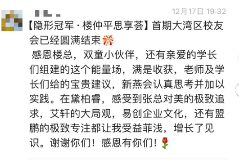 本次大灣區(qū)校友會活動(dòng)圓滿落幕,隱形冠軍樓仲平思享薈也將不定期舉辦川渝地區(qū)、江浙地區(qū)等校友會活動(dòng),通過走進(jìn)學(xué)員企業(yè)研學(xué),加深相互鏈接,將這份源自樓仲平“弟子班”的情誼與溫暖永久地延續(xù)下去!