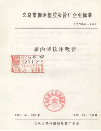 雙童的第一件企業(yè)標準是在1998年4月30日發(fā)布的,也是中國的第一份吸管標準。那時候義烏的小商品普遍以低、小、散、弱為特點,但是雙童沒有隨波逐流,堅持走標準化之路,后來又做了產(chǎn)業(yè)標準、地方標準、國家標準,包括國際標準。