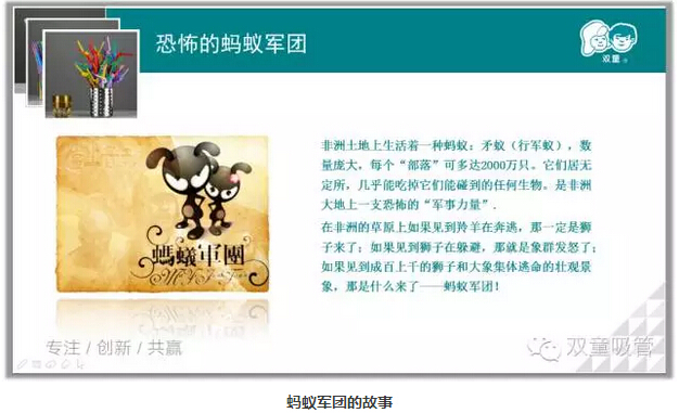 游戲結(jié)束,課程也正式開始啦!妞通過兩個小故事和我們分享了團隊精神,在非洲的大地上有一支恐怖的軍事力量”——螞蟻軍團!成百上千的獅子和大象見到他們就會集體逃命,他們經(jīng)過的地方會寸草不生。一只螞蟻的力量很小,可成千上萬只螞蟻的力量卻是無窮大呀!