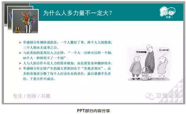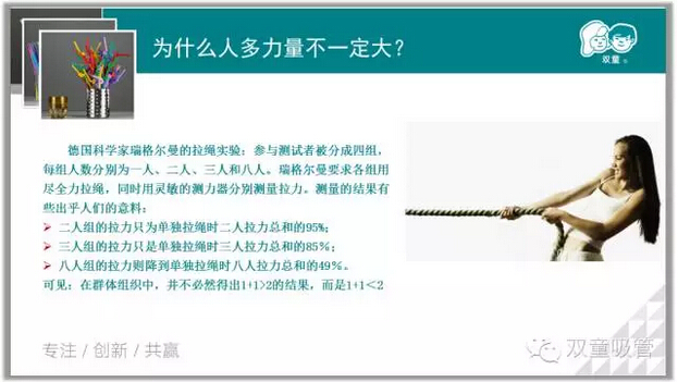 為什么人多不一定力量大呢? 德國科學(xué)家瑞格爾曼的拉繩實驗:參與測試者被分成四組,每組人數(shù)不同。測量的結(jié)果顯示人越多,反而拉力總和越小。可見:在群體組織中,并不必然得出1+1>2的結(jié)果,而是1+12。這也是旁觀者效應(yīng),一個人敷衍了事,兩個人互相推諉,三個人則永無成事之日。也就有了三個和尚沒水喝的故事!