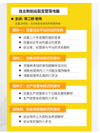 他以雙童內(nèi)部對裂變機制的實際運行狀況為案例教材,將課程分為五大模塊,16個小節(jié),涵蓋了落地實操環(huán)節(jié)中會遇到的各種問題,盡可能最詳細、最全面地交付給學(xué)員操作方法!