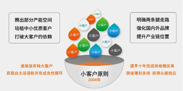 因此,“雙童”推出了小訂單策略,做出規(guī)定:要求業(yè)務(wù)員逐步放棄沒有利潤的大客戶,騰出產(chǎn)能空降培植日本和歐盟的中小客戶;拓展國內(nèi)高端市場和個性化定制,形成“兩條腿走路”布局;每個客戶的訂貨數(shù)量絕不允許超過本廠生產(chǎn)總量的5%。