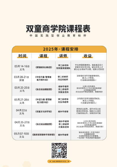 當(dāng)然,企業(yè)運(yùn)轉(zhuǎn)過(guò)程中難免會(huì)遇到特殊情形,“雙童”對(duì)此也有自己的“補(bǔ)救”措施,而且雙童創(chuàng)業(yè)平臺(tái)上90%的總經(jīng)理也都是在這個(gè)辦公室產(chǎn)生的。歡迎參加3月12日雙童文化研學(xué)班》,我們會(huì)邀請(qǐng)高層管理人員為你現(xiàn)場(chǎng)揭秘!