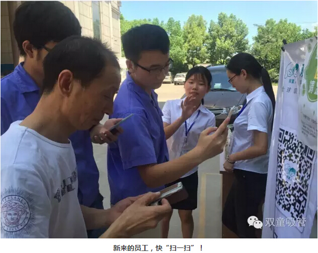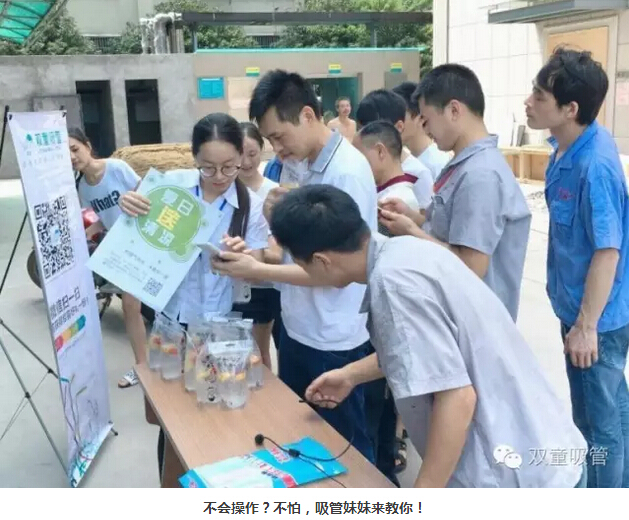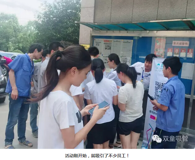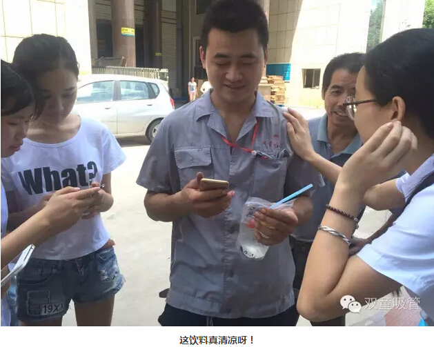 瞧!我們剛開張,就吸引了不少正要去吃飯的員工們。原來,拿到飲料的方法特別簡(jiǎn)單,只需要關(guān)注“雙童吸管”的微信公眾平臺(tái)并轉(zhuǎn)發(fā)微信,即可獲得檸檬氣泡水一袋呢!看來吸管妞為了微信的推廣也是絞盡腦汁啦!