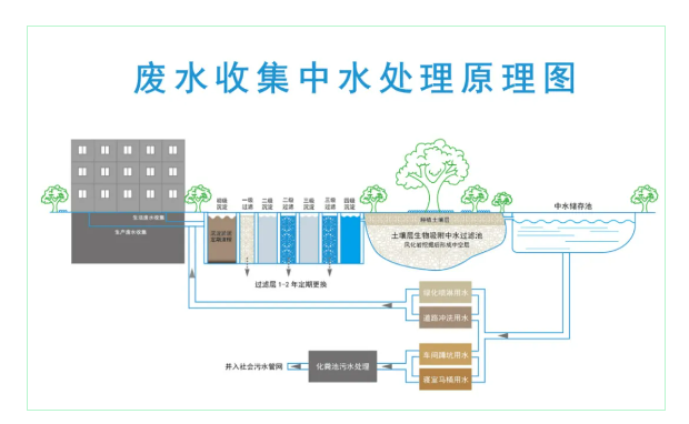 所謂“廢水收集處理循環(huán)回用系統(tǒng)”,就是將員工的生活廢水過濾后匯聚到“ 雙童一號(hào)樹”下進(jìn)行生物吸附處理,形成中水,然后再流入景觀池下的中水儲(chǔ)存池中,以便供給廠區(qū)所有衛(wèi)生間的馬桶沖水、綠化噴淋和道路清洗、車輛清洗所用。
