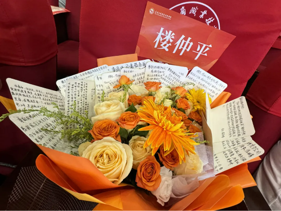 就在樓仲平老師飽含深情地發(fā)表寄語,還未走下講臺(tái)時(shí),上演了一幕意外的溫馨畫面——學(xué)生代表手捧鮮花走上演講臺(tái),將一束精心準(zhǔn)備的花束送到了他手中。令人動(dòng)容的是,花束中還夾雜著數(shù)百封來自學(xué)弟學(xué)妹們的感謝信,每一封信都寫滿了真摯的情感與感激之情。