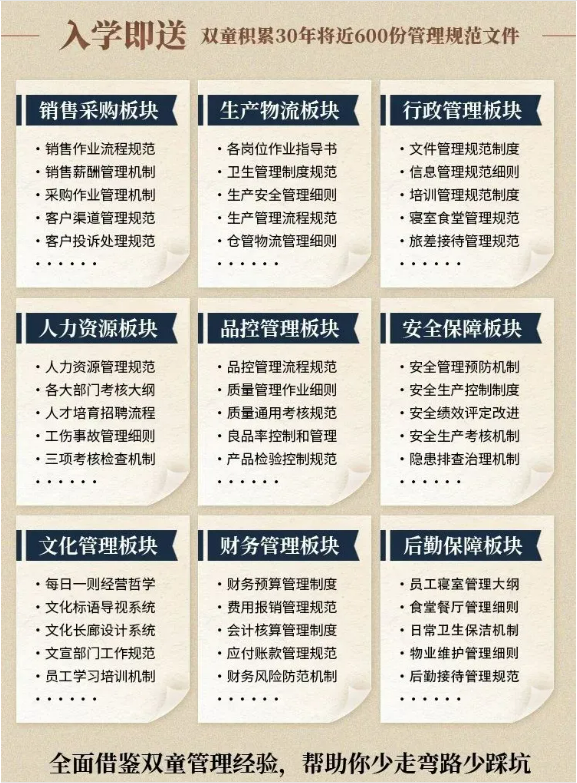 所以,入學“隱形冠軍樓仲平思享薈”之后,項目組會將“雙童”積累了31年、包含了銷售、生產、行政、人力資源、品控、安全、文化管理、財務和后勤等9大板塊,600管理規(guī)范文件,全部打包給學員,幫助學員企業(yè)能夠全面借鑒雙童管理經驗、少走彎路、少踩坑!